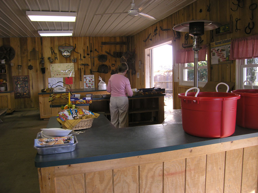 ![]() Late Fall 2005 - Maureen prepares for the Farm Staff Party out in the stand. We have THE BEST employees and really appreciate all their efforts throughout the season to make your experience at Homestead Farm enjoyable. |