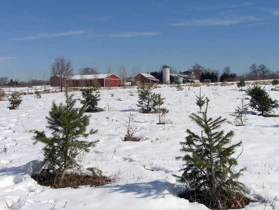 February 2006 - The house and barns from the back fields. Little Christmas trees too.